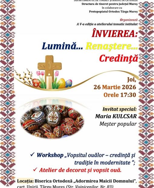 EVENIMENT. Cu ocazia apropierii Marelui Praznic al Învierii Domnului, la Târgu Mureș va avea loc o nouă ediție a atelierului tematic „Învierea: Lumină… Renaștere… Credință”, un eveniment dedicat copiilor și tinerilor.